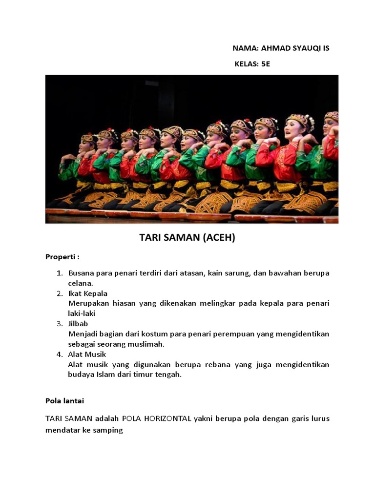 Tari saman merupakan tarian adat nusantara yang berasal dari provinsi nangroe aceh darussalam. Pola lantai yang ada pada tari saman disimpulkan hanya menggunakan pola garis atau pola bersyaf. Semoga bermanfaat dan jangan lupa. Pola lantai dari tari saman adalah pola horizontal yakni berupa pola dengan garis lurus mendatar ke samping. Pengertian lainnya yaitu pola lantai horizontal dalam tari saman menggambarkan umat islam yang sedang membentuk staf sholat dimana tiap makmum merapatkan diri supaya menjaga kekhusyukan ketika sholat berlangsung. Pola lantai tari saman ketika dipentas terlihat biasa tapi sebenarnya gerakan tari saman tergolong sulit. Pola lantai horizontal pola lantai horizontal : Hal tersebut menyesuaikan gerakan dan formasi yang dibuat dalam tarian. Garis lurus dalam bentuk vertikal atau ke atas menunjukkan hubungan dengan tuhan sebagai pencipta. Pola lantai pada gerak tari. · pola lantai melingkar : Ada banyak bentuk sehingga dibutuhkan konsentrasi tinggi, termasuk juga kekompakan dan rasa saling percaya dalam grub. Terdapat unsur penting dalam tarian itu, contohnya teladan lantai.